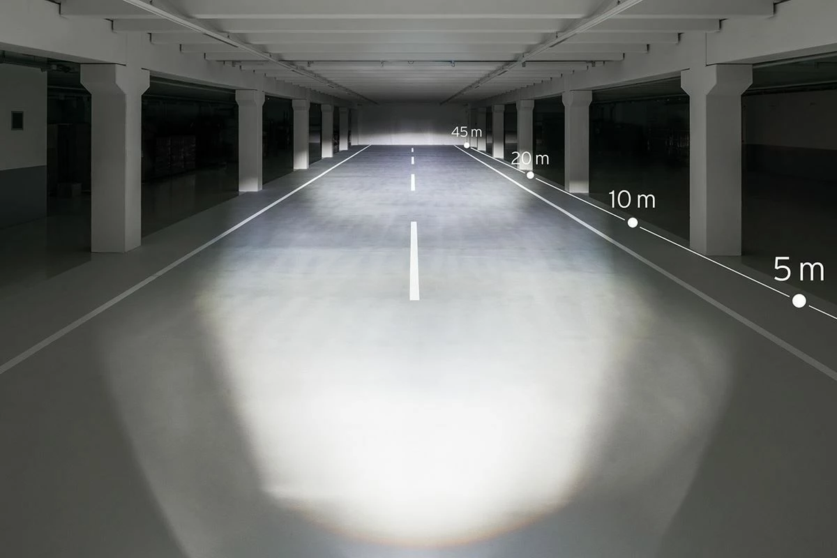 Die serienmäßige Sicherheitsausstattung: Sensorgesteuertes Tagfahrlicht, Standlicht und ein flexibler Mehrgelenk-Scheinwerferhalter mit integriertem Kabelkanal, der auch Überkopfmontage möglich macht.