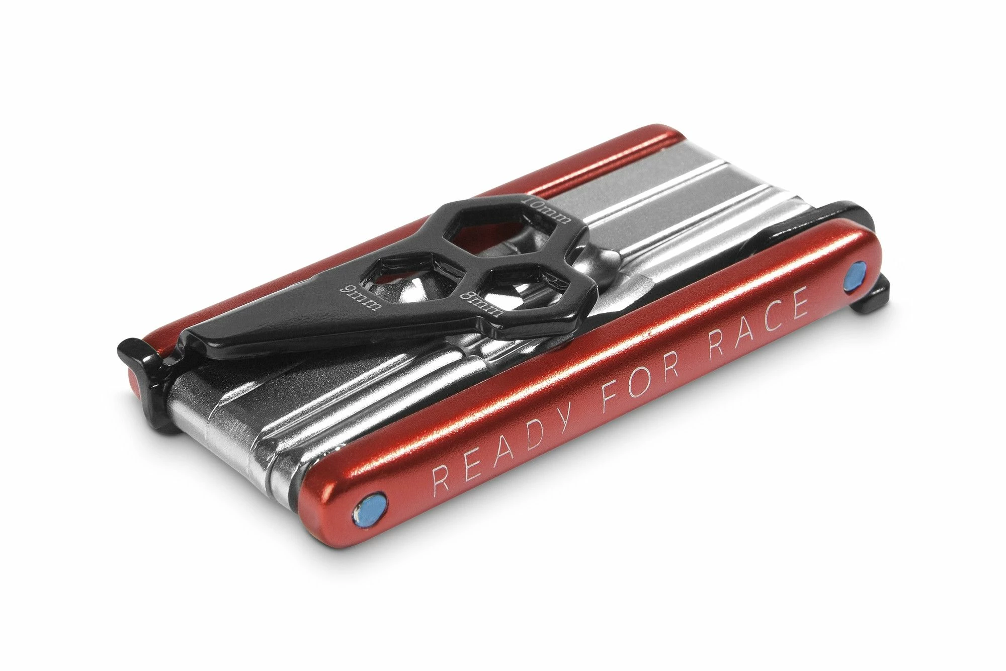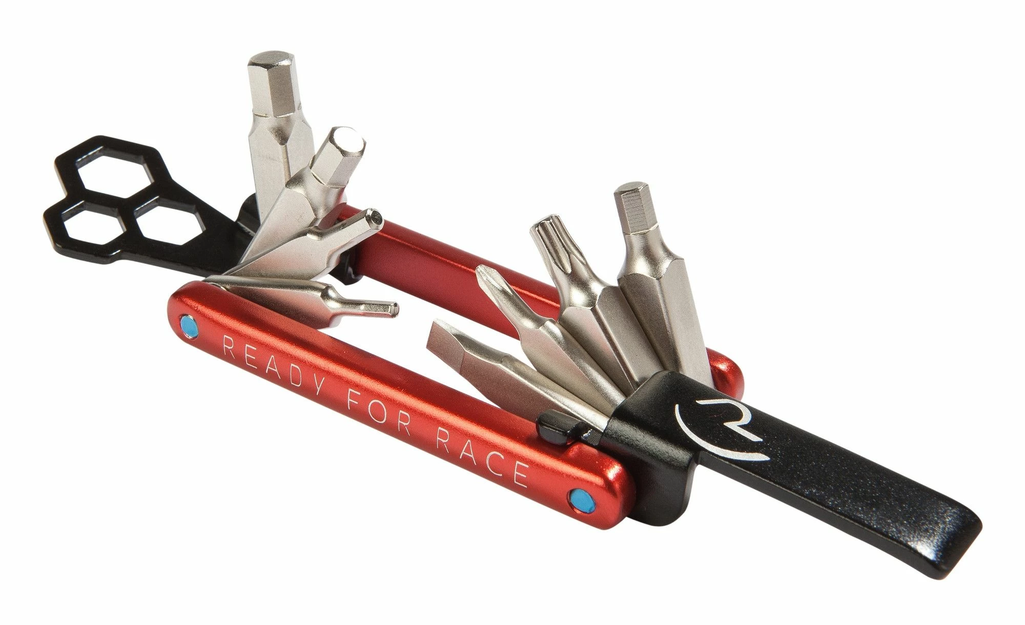 Kompaktes Multi Tool mit zwölf Funktionen. Das Werkzeug besteht aus fünf Innensechskantschlüsseln (Hex 2/3/4/5/6 mm), einem Rundinnensechskantschlüssel 25, einem Phillips Kreuzschraubendreher Größe 1, einem 5 mm Schlitzschraubendreher, drei Ringschlüsseln 8/9/10 mm sowie einem Reifenheber. Mit diesen Werkzeug sind sie für jede Tour sehr gut ausgerüstet.