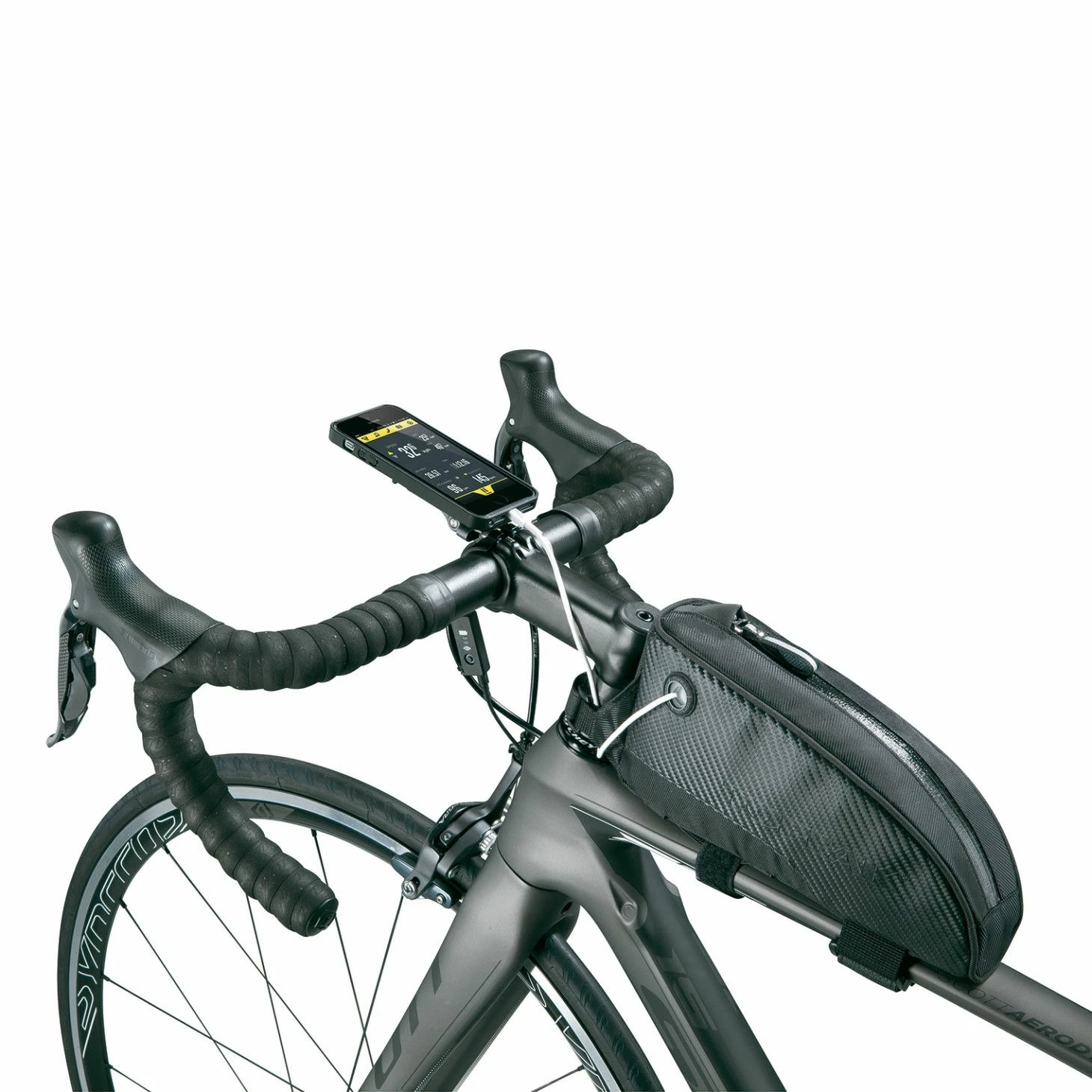 Die große, praktische Tasche zur Montage am Oberrohr gewährt schnellen und einfachen Zugriff auf Riegel, Telefon, Geldbörse, Werkzeug oder sonstiges wichtiges Zubehör. Durch die gummierte Kabelöffnung können elektronische Geräte während der Fahrt geladen werden (Mobile PowerPack vorrausgesetzt).